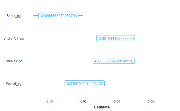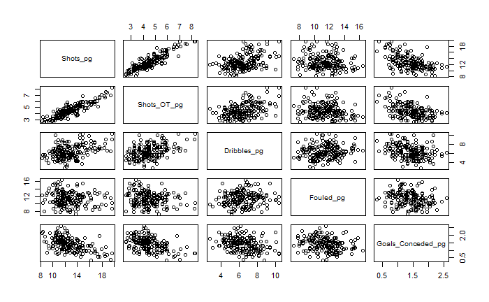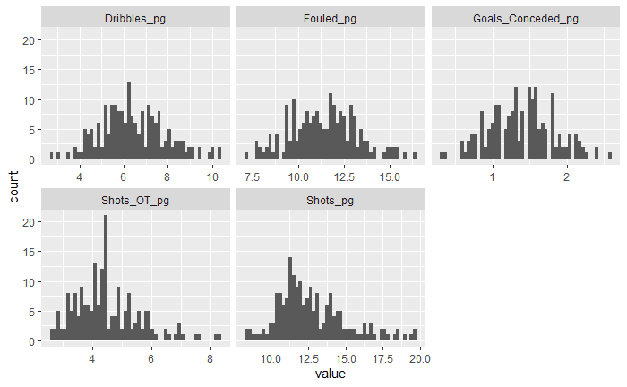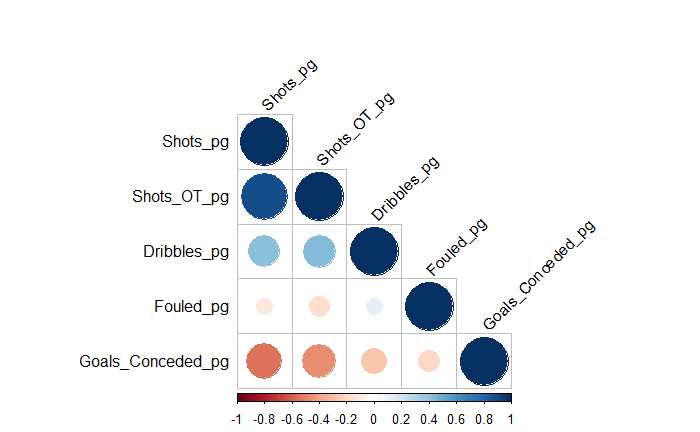 - Performed exploratory analysis on correlation of each variable and how each variable is distributed (shots per game, shots on target per game, dribbles per game, number of times fouled per game)